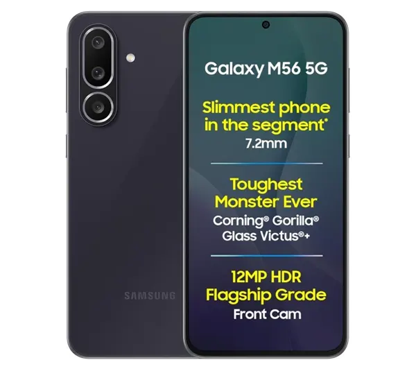 The Samsung Galaxy M56 is designed for power-hungry users who need all-day endurance. With a huge battery, immersive AMOLED display, and capable cameras, the M56 is perfect for streaming, gaming, and long workdays. It brings Samsung’s reliable One UI software and 5G connectivity to the popular Galaxy M series in 2025.